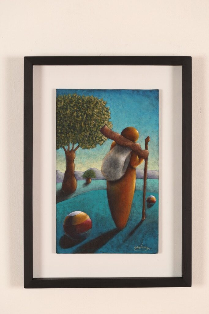 Manifiesto: Recolector de la vida, es una obra donde represento la lucha diaria y la dedicación de un hombre que se dirige al monte para recolectar leña, un acto fundamental para el sustento de su familia. La obra captura la esencia de la labor y la conexión del hombre con la naturaleza. Se centra en la figura del leñador, que camina con determinación hacia el bosque, cargado con sus herramientas. El fondo muestra un paisaje con árboles, Los colores predominantes son tonos azulados, verdes y marrones, que evocan la sensación de estar en un entorno natural y rural.