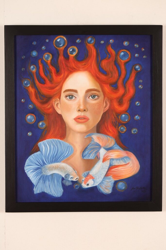 Manifiesto: En la vida atravesamos momentos intensos en los que debemos tomar decisiones y al sopesar las alternativas nos vemos invadidos por sentimientos que muchas veces son contrarios, lo cual dificulta la elección. Sentimos alegría y tristeza, entusiasmo y miedo al mismo tiempo con las opciones presentadas o los caminos que tenemos para elegir. En la obra se presenta esa contraposición a través de los colores fríos y cálidos, el agua y el cabello de fuego de la joven, incluso en los peces que se colocan frente a frente en una composición dinámica que incita la curiosidad.