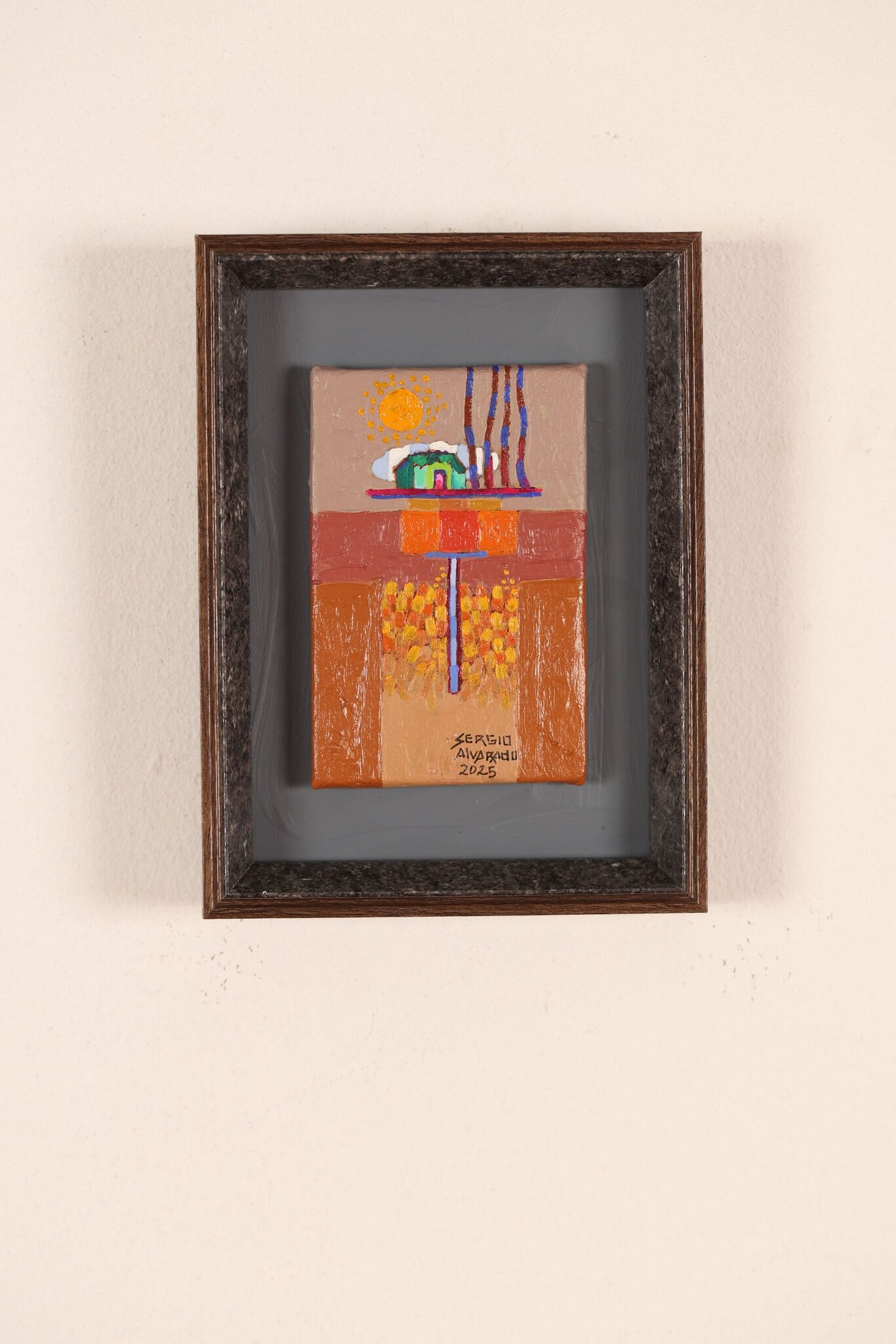 En esta colección empiezo a simplificar mi paisaje con áreas planas más grandes como los tejidos, con la espiritualidad del paisaje y a trabajar más de memoria a través de la guía de mi intuición, siempre resaltando los colores textiles, agregando líneas horizontales, verticales y curvas, simbolizando los bellos surcos, los puntos que representan el orden de la siembra del maíz con sus veredas y monjones , reflejando en mi paisaje el silencio y su misterio, donde las familias se encuentran en el interior de las casas y afuera se ve la huella del hombre a través de los surcos, es encontrar en las entrañas del paisaje rural a través de mi imaginación en cada obra está la espiritualidad… entre más profundo llegó, cada vez más abstracto.-