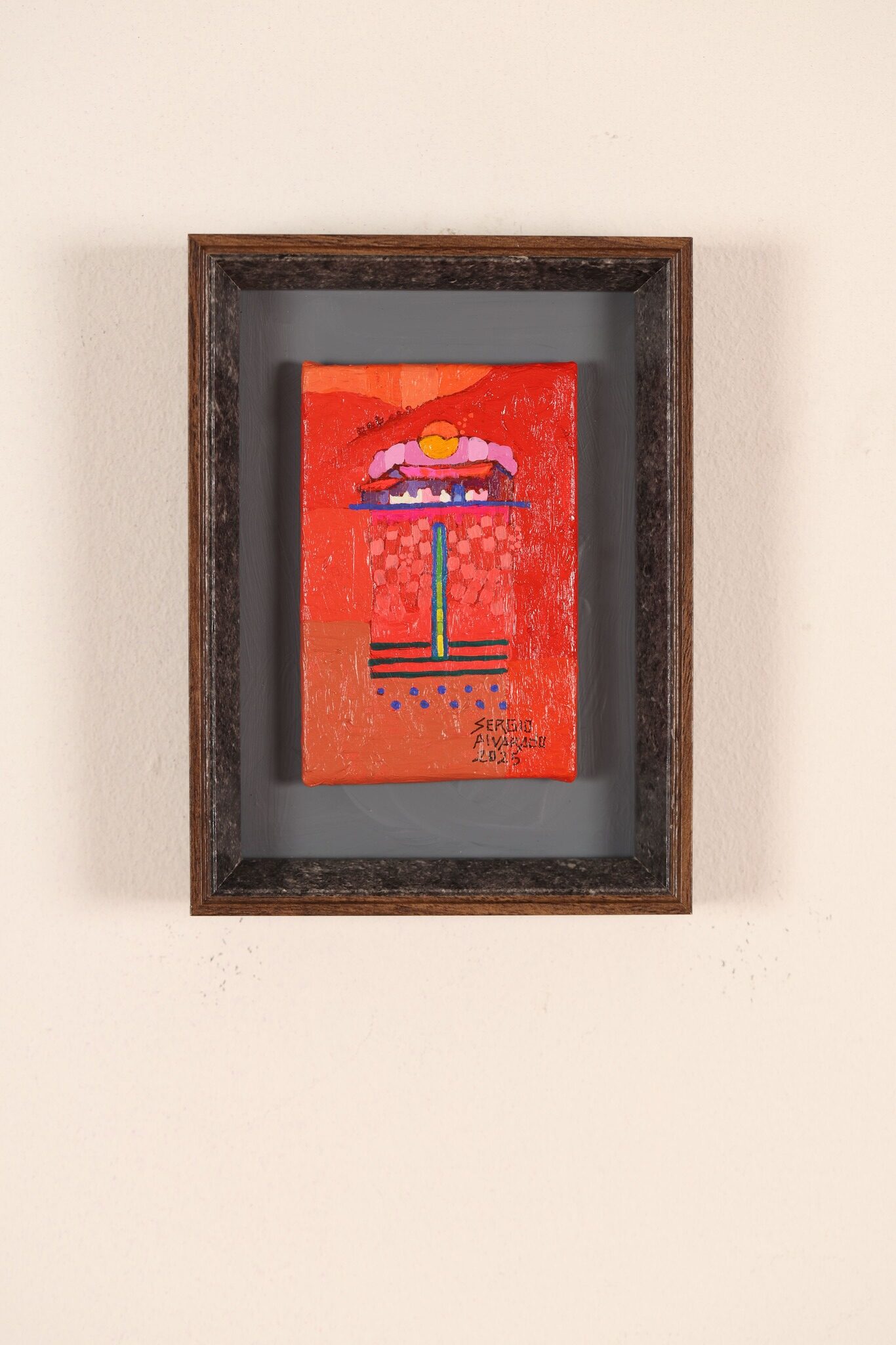 En esta colección empiezo a simplificar mi paisaje con áreas planas más grandes como los tejidos, con la espiritualidad del paisaje y a trabajar más de memoria a través de la guía de mi intuición, siempre resaltando los colores textiles, agregando líneas horizontales, verticales y curvas, simbolizando los bellos surcos, los puntos que representan el orden de la siembra del maíz con sus veredas y monjones , reflejando en mi paisaje el silencio y su misterio, donde las familias se encuentran en el interior de las casas y afuera se ve la huella del hombre a través de los surcos, es encontrar en las entrañas del paisaje rural a través de mi imaginación en cada obra está la espiritualidad… entre más profundo llegó, cada vez más abstracto.-
