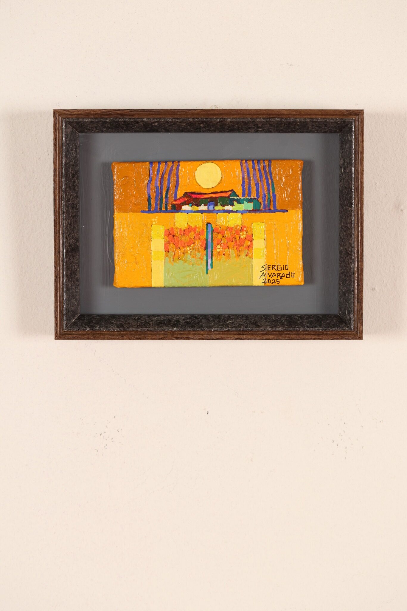 En esta colección empiezo a simplificar mi paisaje con áreas planas más grandes como los tejidos, con la espiritualidad del paisaje y a trabajar más de memoria a través de la guía de mi intuición, siempre resaltando los colores textiles, agregando líneas horizontales, verticales y curvas, simbolizando los bellos surcos, los puntos que representan el orden de la siembra del maíz con sus veredas y monjones , reflejando en mi paisaje el silencio y su misterio, donde las familias se encuentran en el interior de las casas y afuera se ve la huella del hombre a través de los surcos, es encontrar en las entrañas del paisaje rural a través de mi imaginación en cada obra está la espiritualidad… entre más profundo llegó, cada vez más abstracto.-