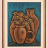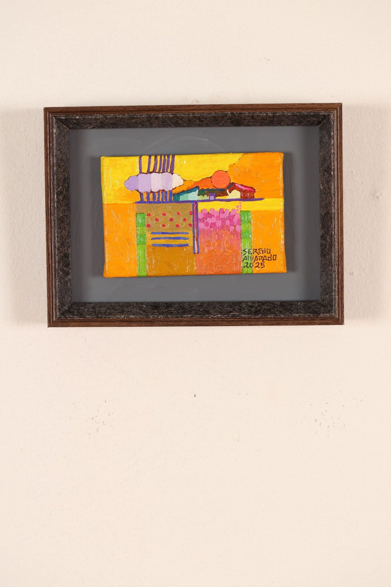 En esta colección empiezo a simplificar mi paisaje con áreas planas más grandes como los tejidos, con la espiritualidad del paisaje y a trabajar más de memoria a través de la guía de mi intuición, siempre resaltando los colores textiles, agregando líneas horizontales, verticales y curvas, simbolizando los bellos surcos, los puntos que representan el orden de la siembra del maíz con sus veredas y monjones , reflejando en mi paisaje el silencio y su misterio, donde las familias se encuentran en el interior de las casas y afuera se ve la huella del hombre a través de los surcos, es encontrar en las entrañas del paisaje rural a través de mi imaginación en cada obra está la espiritualidad… entre más profundo llegó, cada vez más abstracto.-
